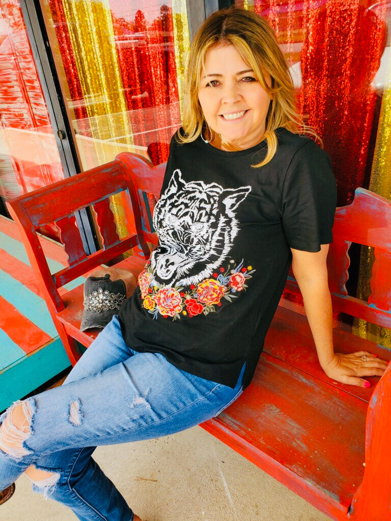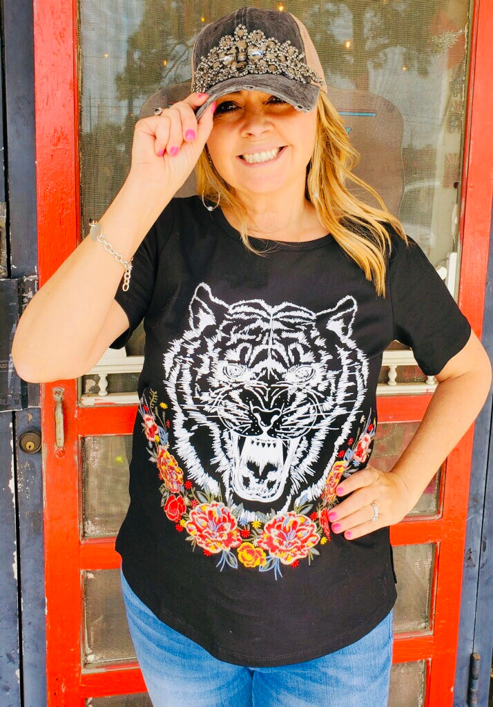 Black & White Heavy Embroidery Tiger With Flowers Short Sleeve Top