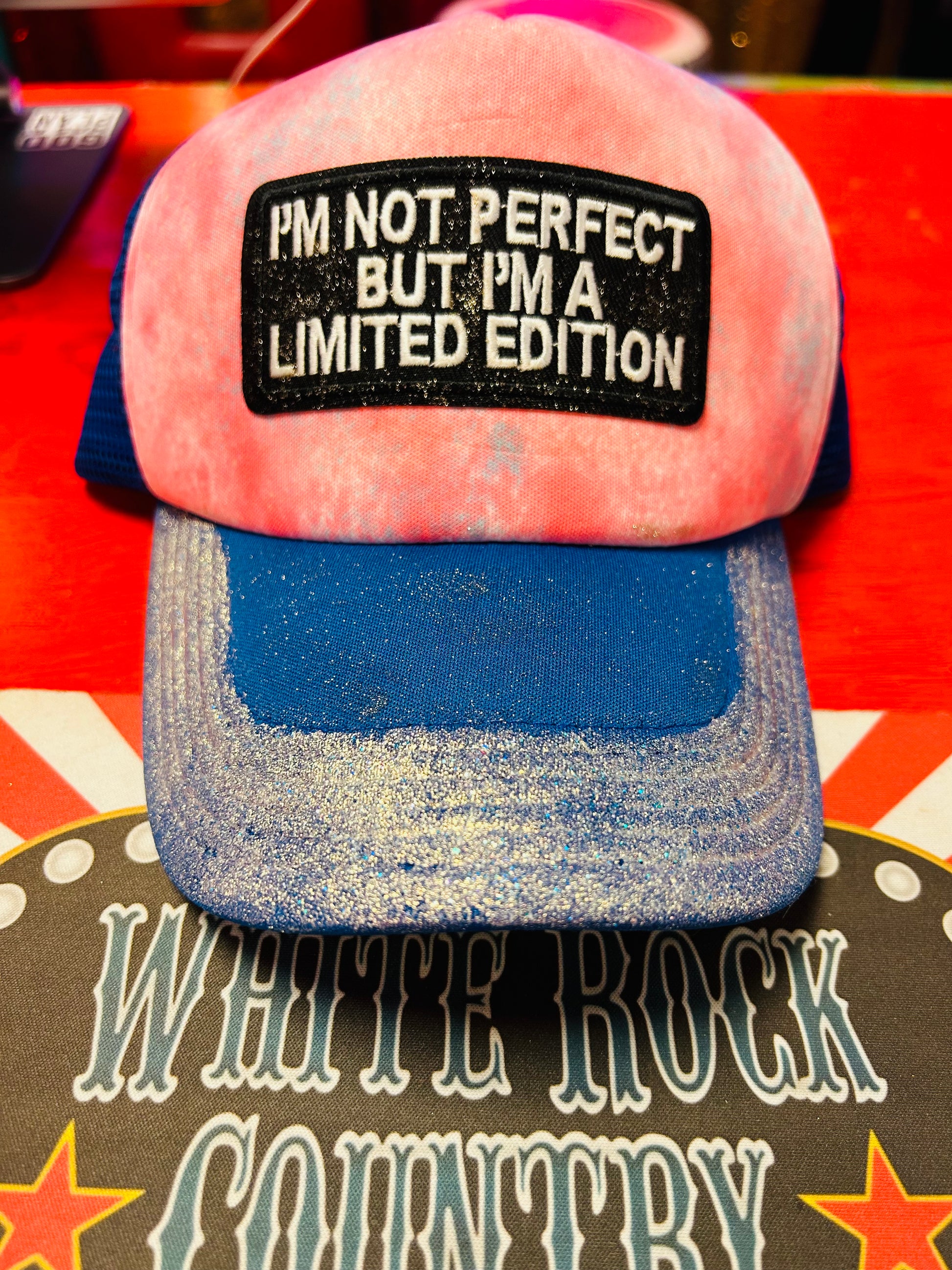 Im not perfect but im a limited edition royal blue with glitter trucker cap