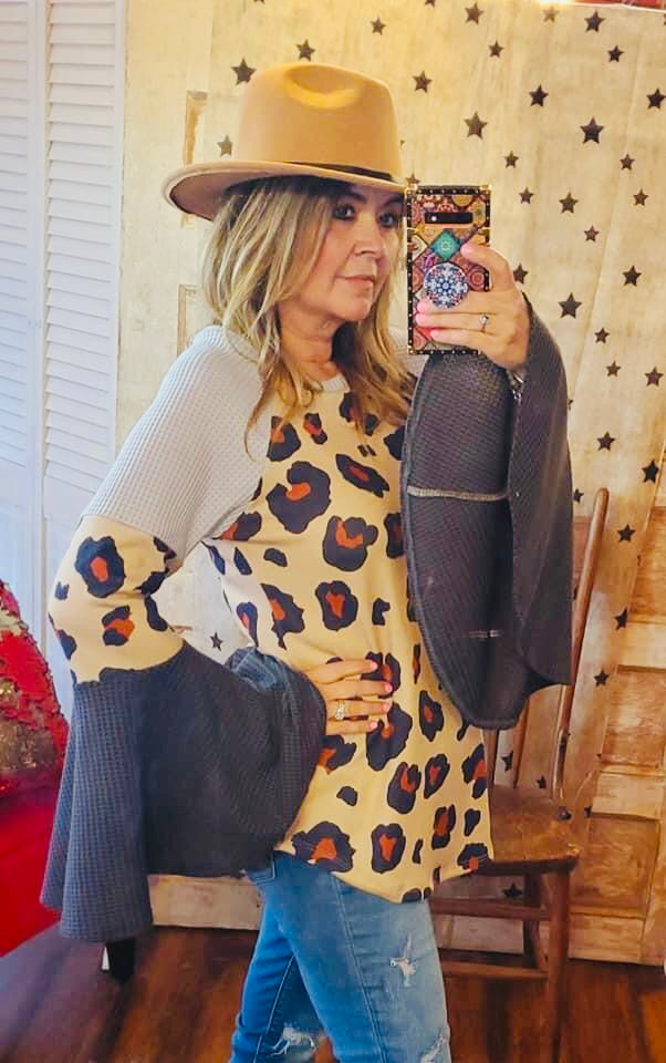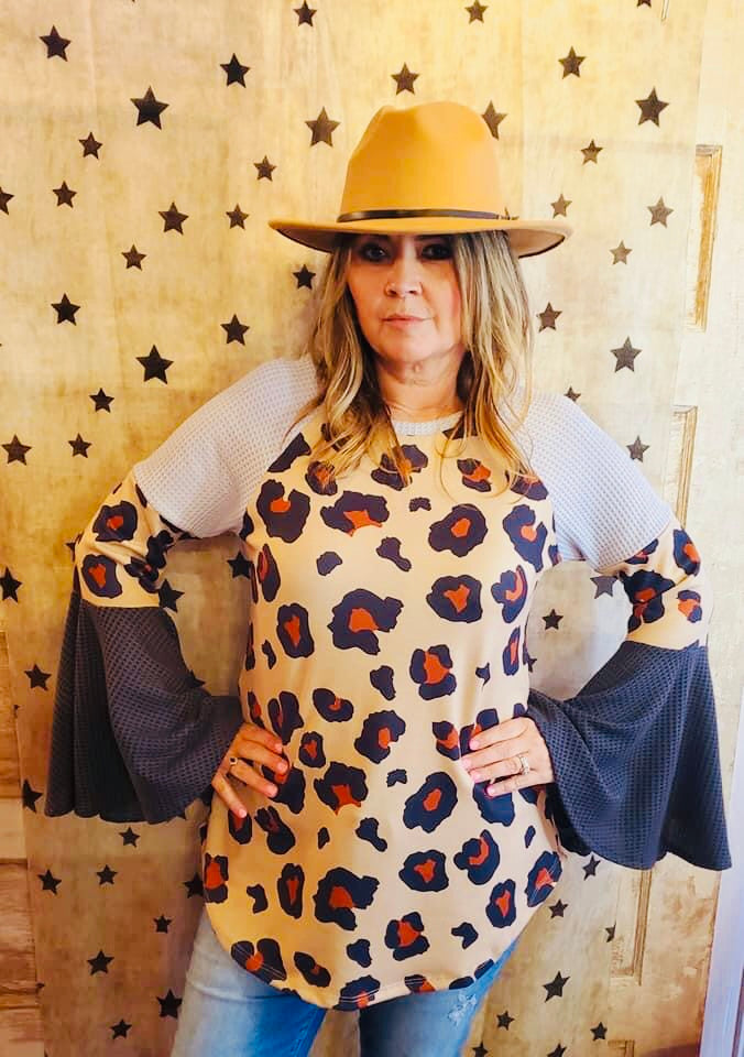 WAFFLE LEOPPARD PRINT MULTI GRAY COLOR TOP WITH BELL SLEEVE