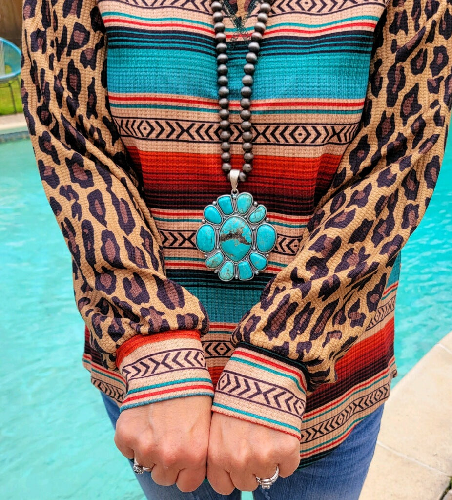 The Raquel Top is A Awesome Long Sleeve Leopard & Serape Print With A Curved Hem That Can Be Dressed Up Or Down